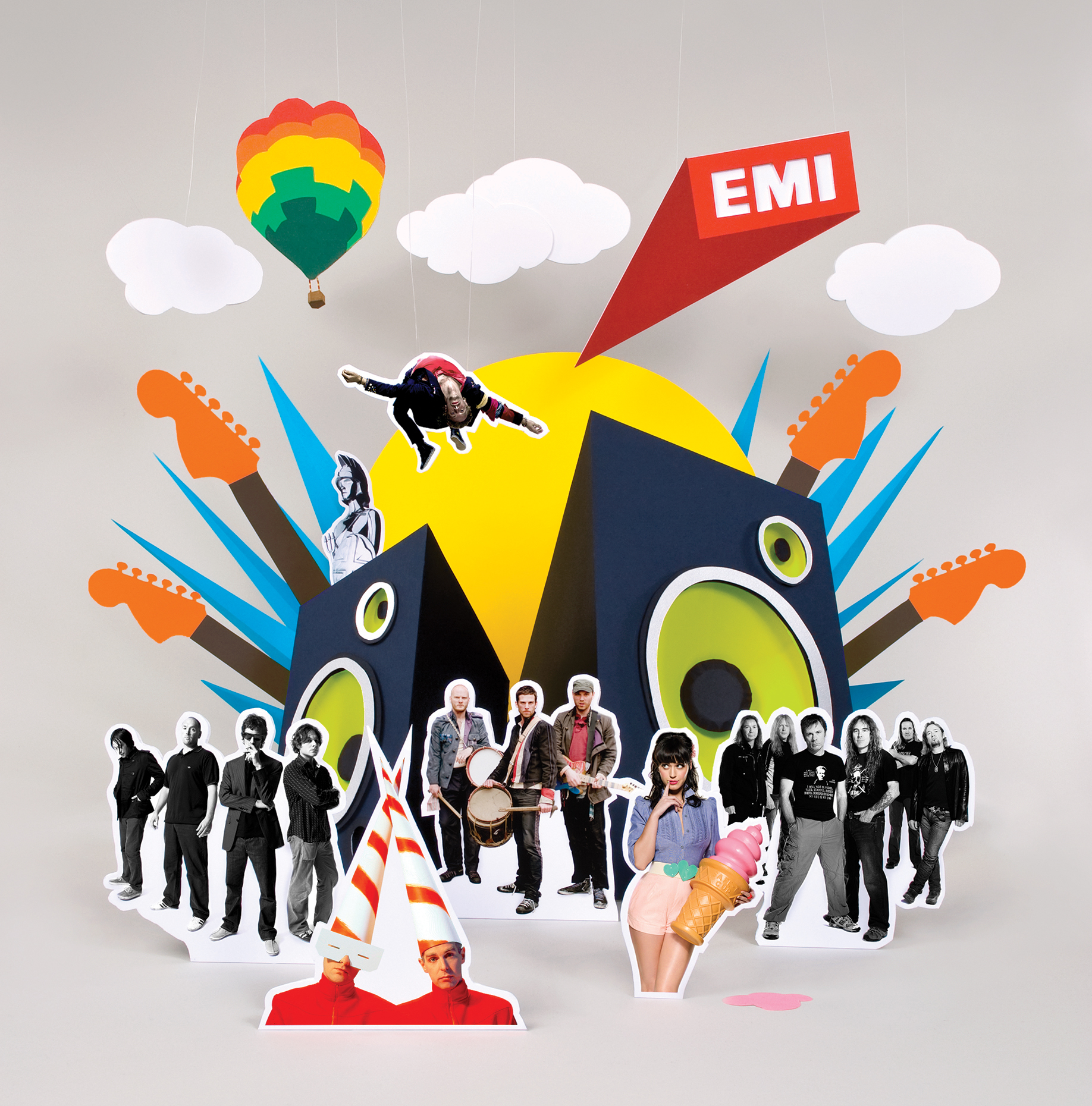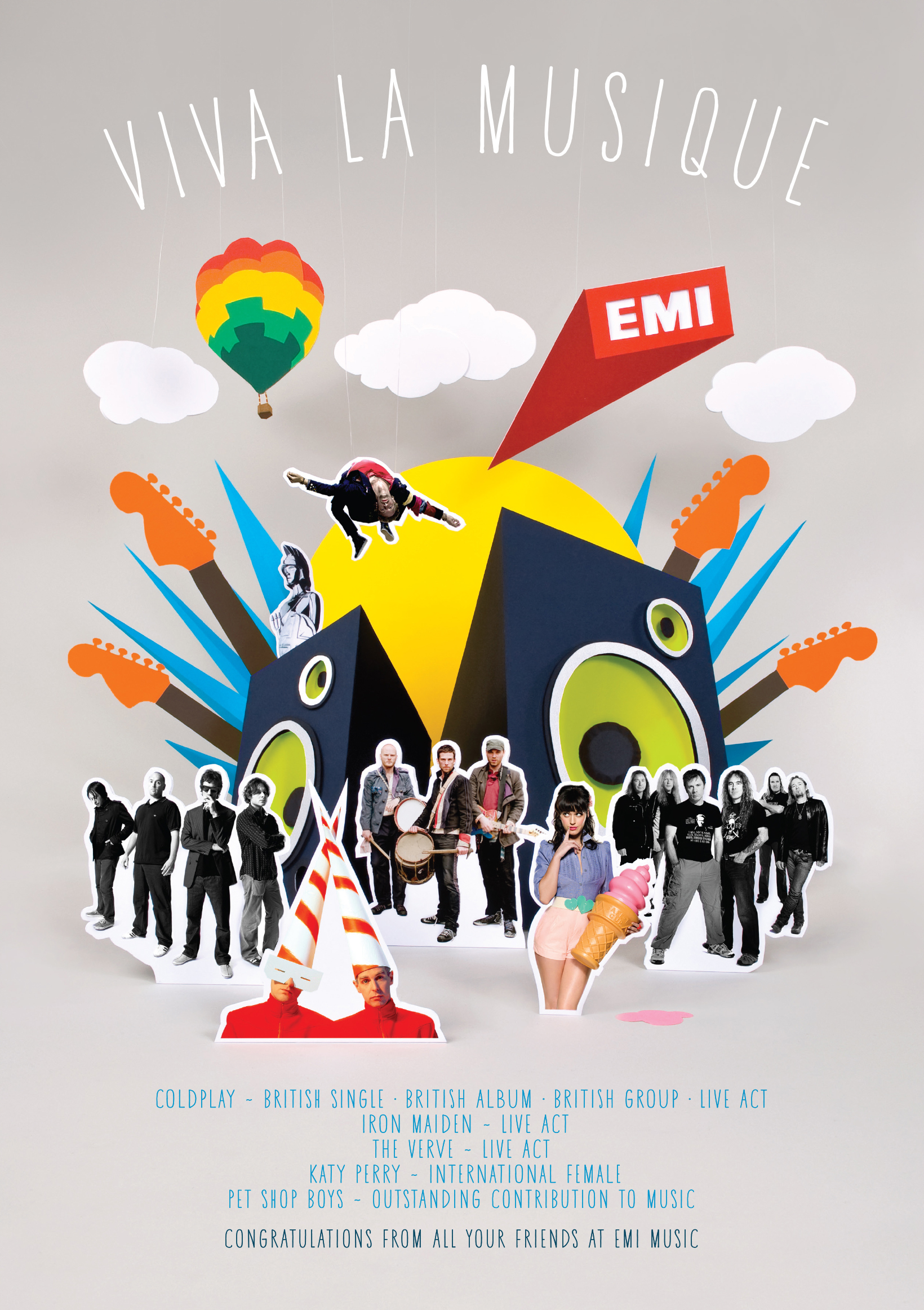 Created entirely from card and foam board this press advertisement celebrates the EMI artists nominated for Brit awards in 2009.