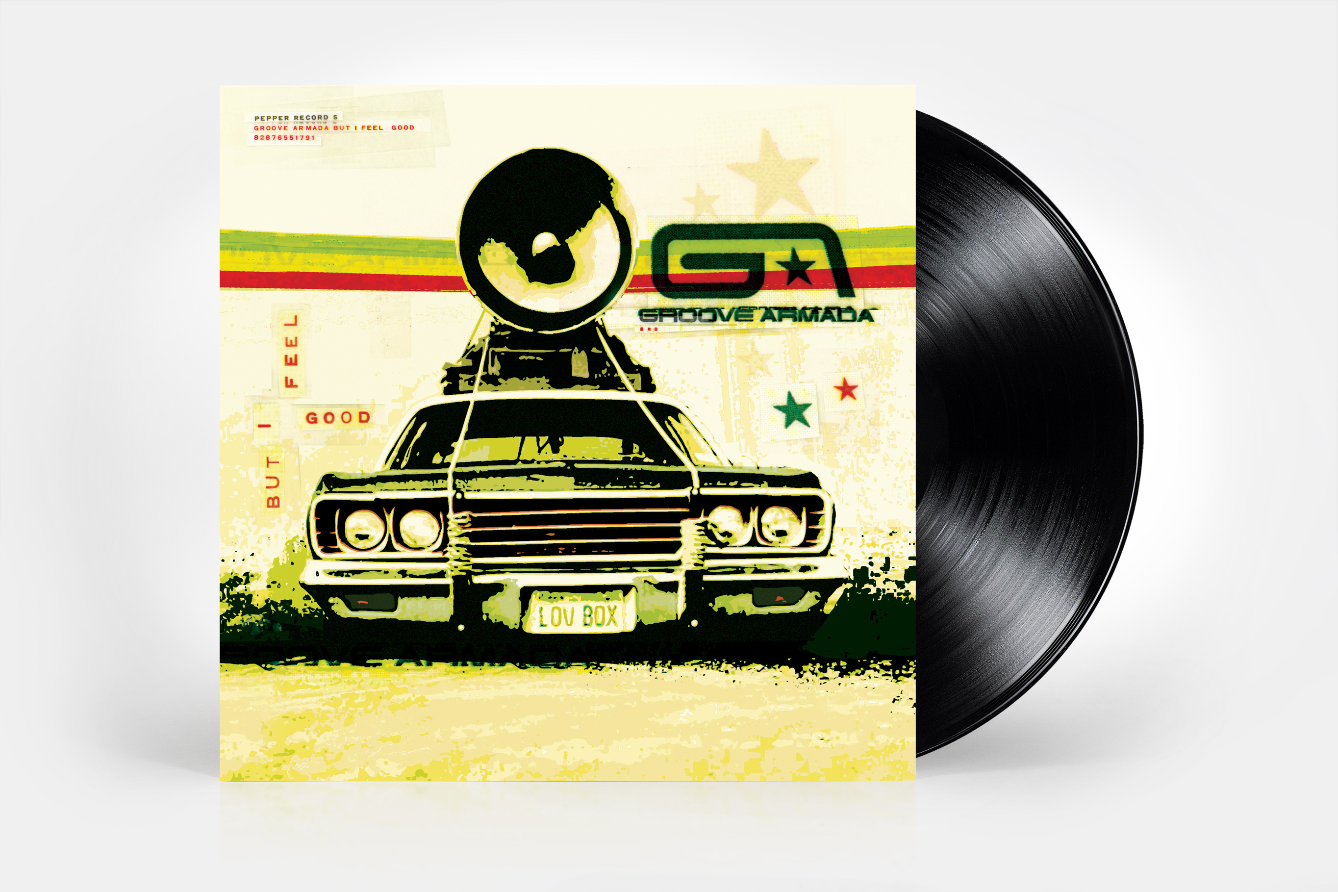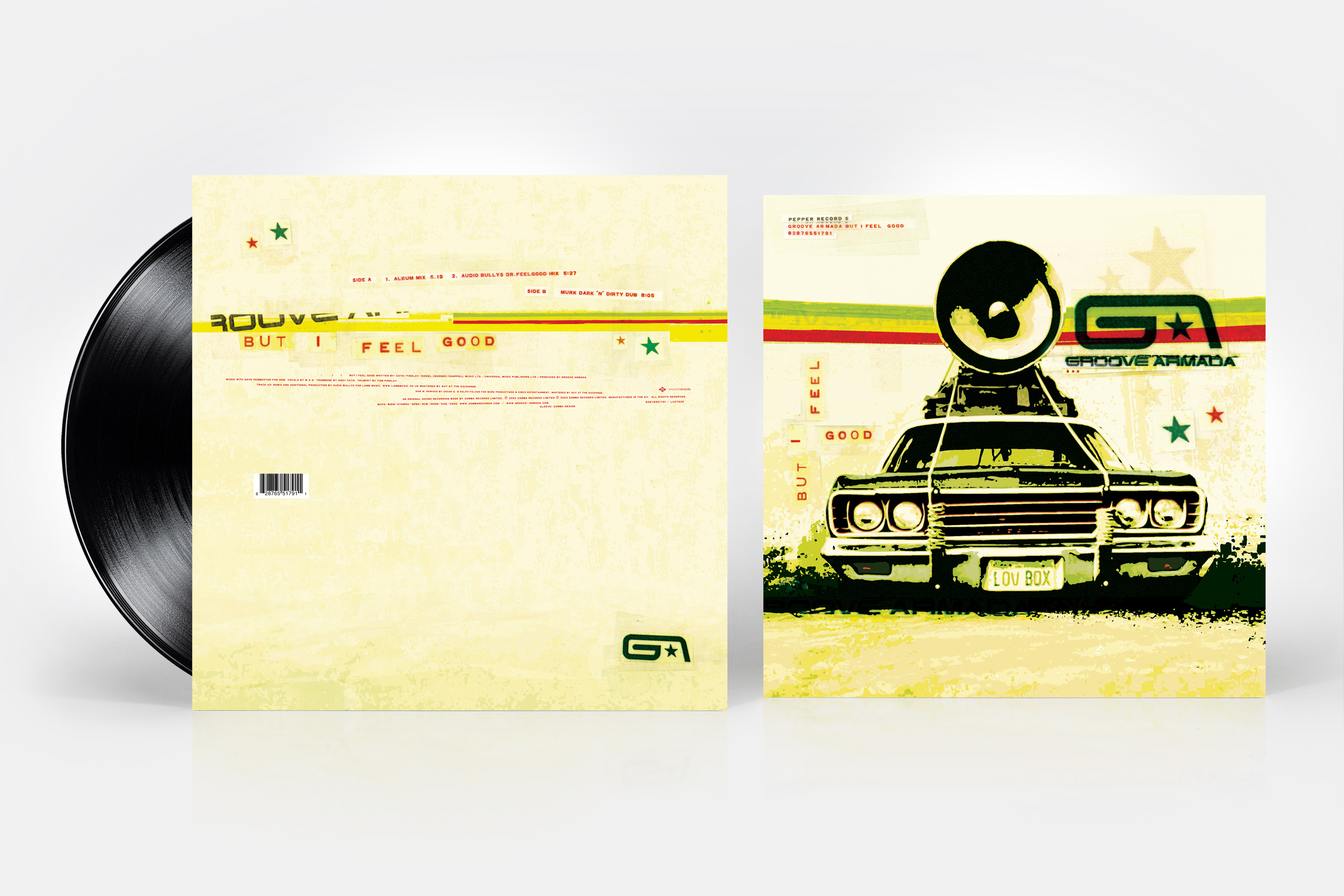 As all previous artwork for Groove Armada had been clean and slick the reggae track ‘But I Feel Good’ presented the opportunity to flip the groups graphic aesthetic. Images were distressed and degraded, cut-out type was roughly applied with visible sellotape giving a handmade appeal. Featured is the 12” sleeve front/back and both CD sleeves.